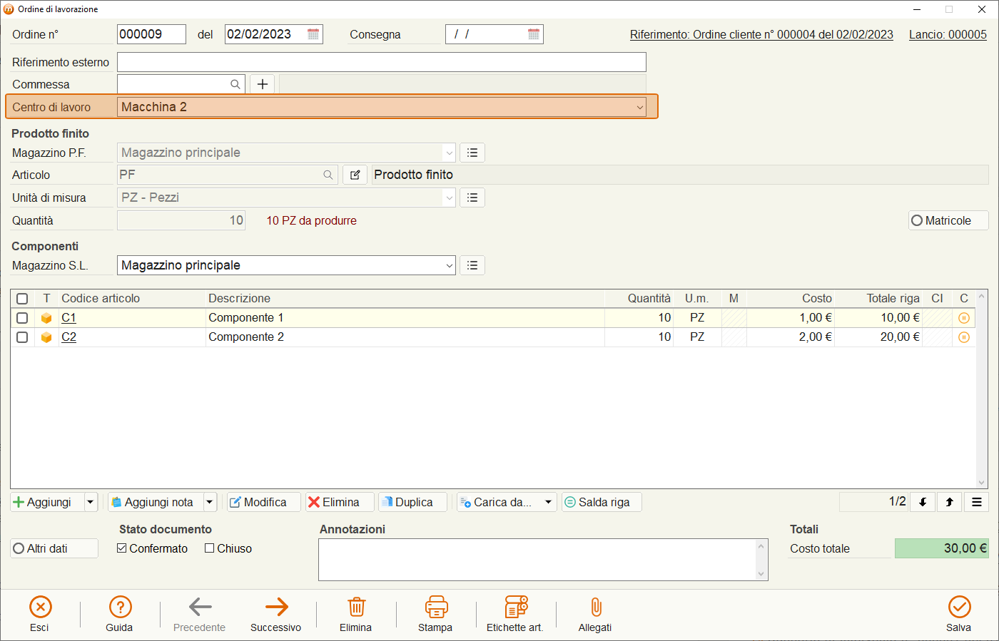 - Centro di lavoro che si occuperà della produzione del prodotto finito. Il centro di lavoro può essere selezionato dal menu a tendina dove sono elencati tutti quelli definiti in configurazione (la procedura è descritta in seguito in un paragrafo dedicato). In questo caso è la Macchina 2.