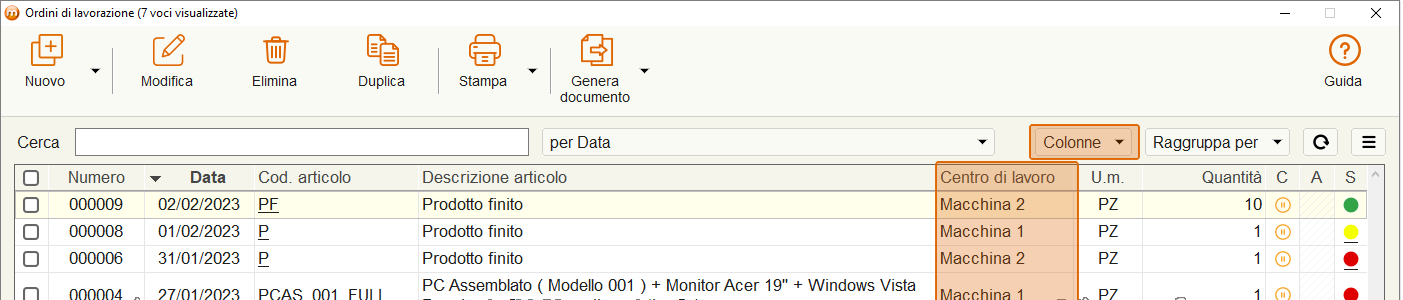 Nell’elenco degli ordini di lavorazione è possibile abilitare, tramite il menu colonne evidenziato nell'immagine qui sotto, la visualizzazione del centro di lavoro a cui è associato ogni ordine.