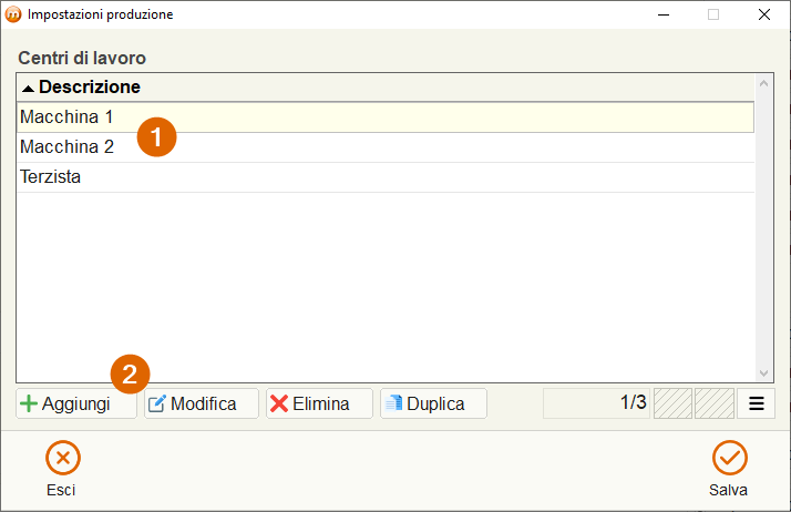 - Qui è riportato l’elenco dei Centri di lavoro già inseriti, nel caso in esempio si tratta di due macchine automatiche, Macchina 1 e Macchina 2, e un Terzista.
