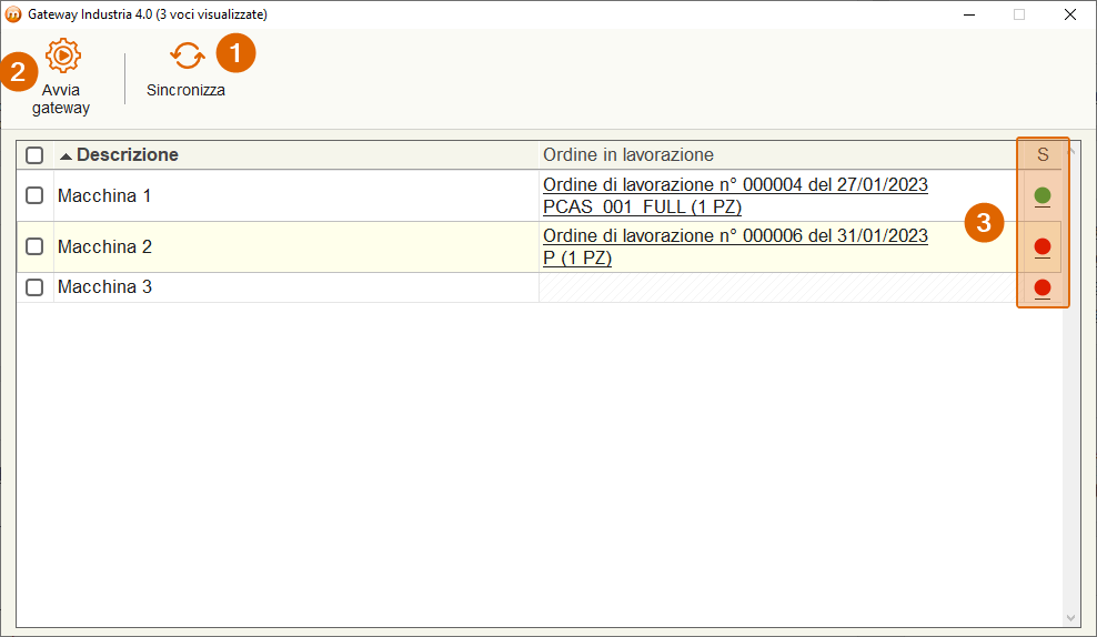 - Stato del gateway: il pallino di colore verde indica che il gateway è avviato mentre quello di colore rosso indica che è sospeso. Cliccando sul pallino saranno mostrati tutti gli ordini di lavorazione in coda sul corrispondente centro di lavoro, nell'ordine in cui saranno processati.
