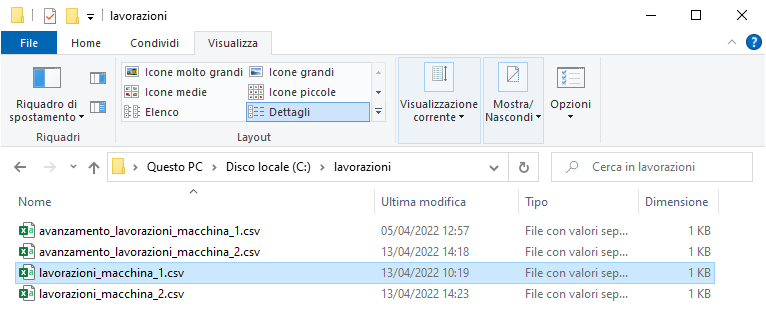 In questo esempio la cartella di scambio è c:\lavorazioni\ e contiene i file degli ordini di lavorazione (lavorazioni_macchina_1.csv e lavorazioni_macchina_2.csv) da completare e quelli relativi all'avanzamento delle lavorazioni eseguite dalle macchine (avanzamento_lavorazioni_macchina_1.csv e avanzamento_lavorazioni_macchina_2.csv).
