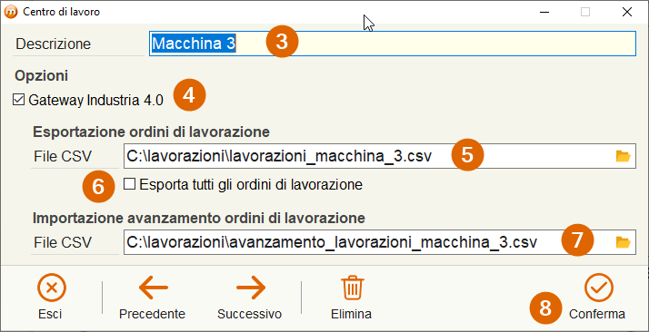 Di seguito riportiamo l’elenco dei campi contenuti nel file CSV, che deve restituire la macchina automatica, relativo all’avanzamento dell’ordine in corso sul centro di lavoro.