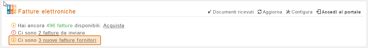 Quando si ricevono delle fatture elettroniche dai propri fornitori, nella sezione Fatture elettroniche della dashboard viene mostrato un messaggio, evidenziato nell'immagine qui sotto, che avverte della ricezione di tali fatture e ne riporta il conteggio.
