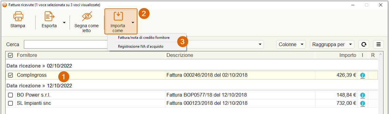Importazione come Fattura / nota di credito fornitore