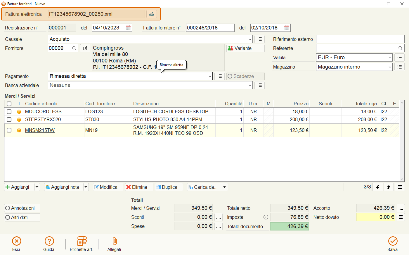 Avviando questo tipo di importazione saranno caricate le righe del documento, se si tratta di merci o servizi già codificati (sono riconosciuti tramite il codice fornitore, se già presente in Mon Ami 3000, o tramite il codice articolo interno).