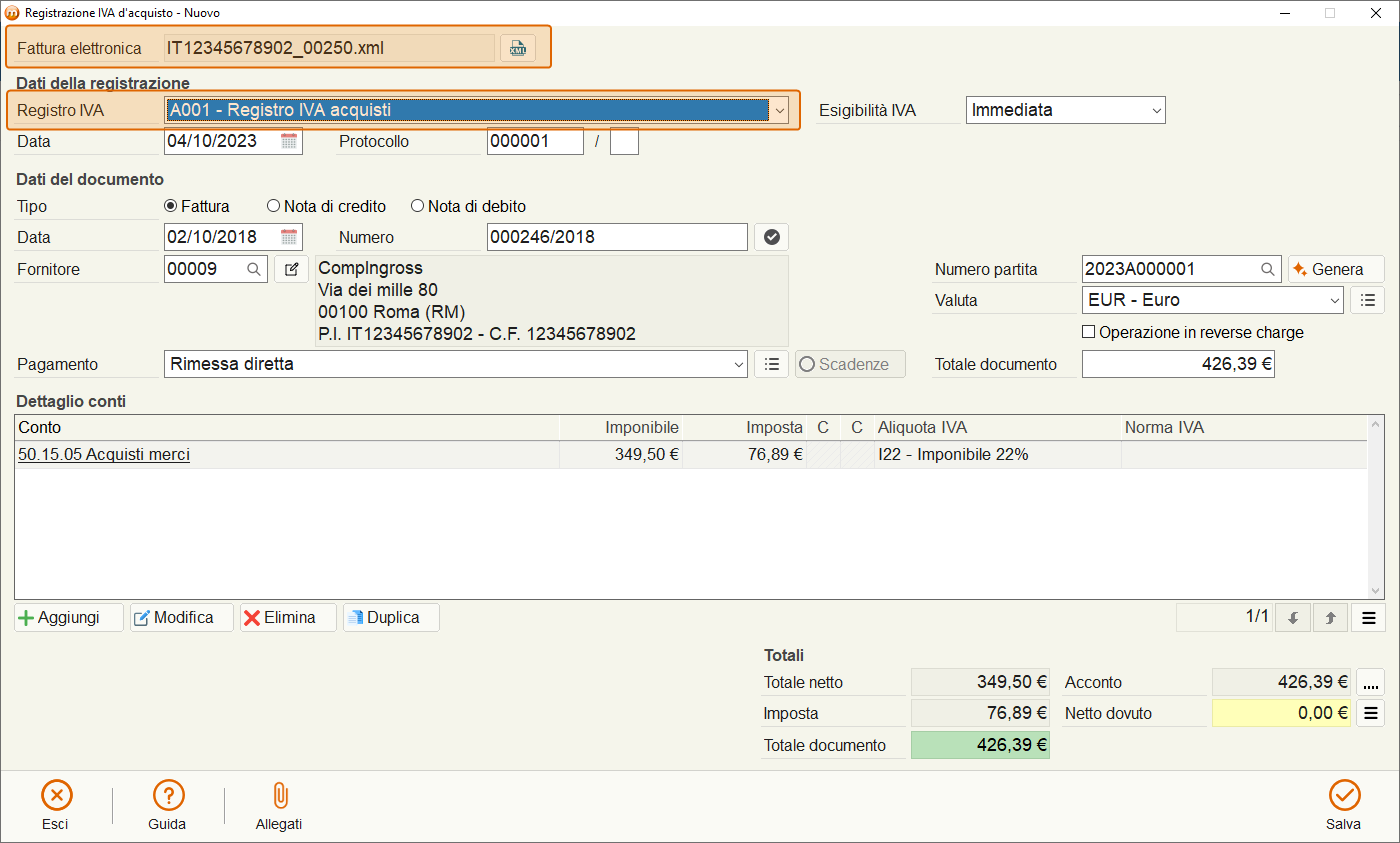 Registrazione IVA d'acquisto: clicca su questa voce se non devi caricare la merce in magazzino e ti interessa solo effettuare la registrazione contabile. Si aprirà la registrazione IVA già compilata con i dati presenti nella fattura elettronica. Il conto utilizzato nel Dettaglio conti è quello impostato nell'anagrafica del fornitore, ma potrai modificarlo con uno qualsiasi del piano dei conti. Fatte le opportune verifiche e modifiche, salva la registrazione.