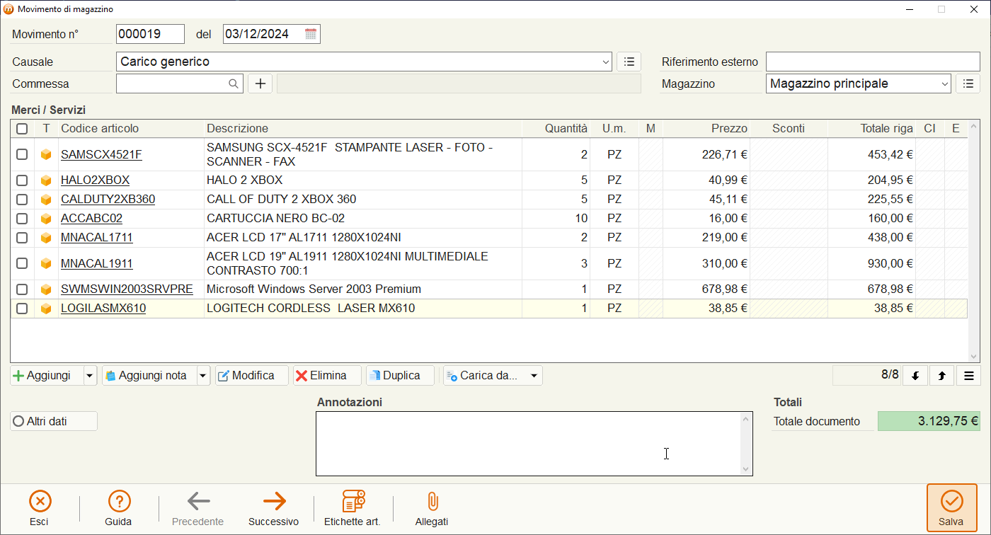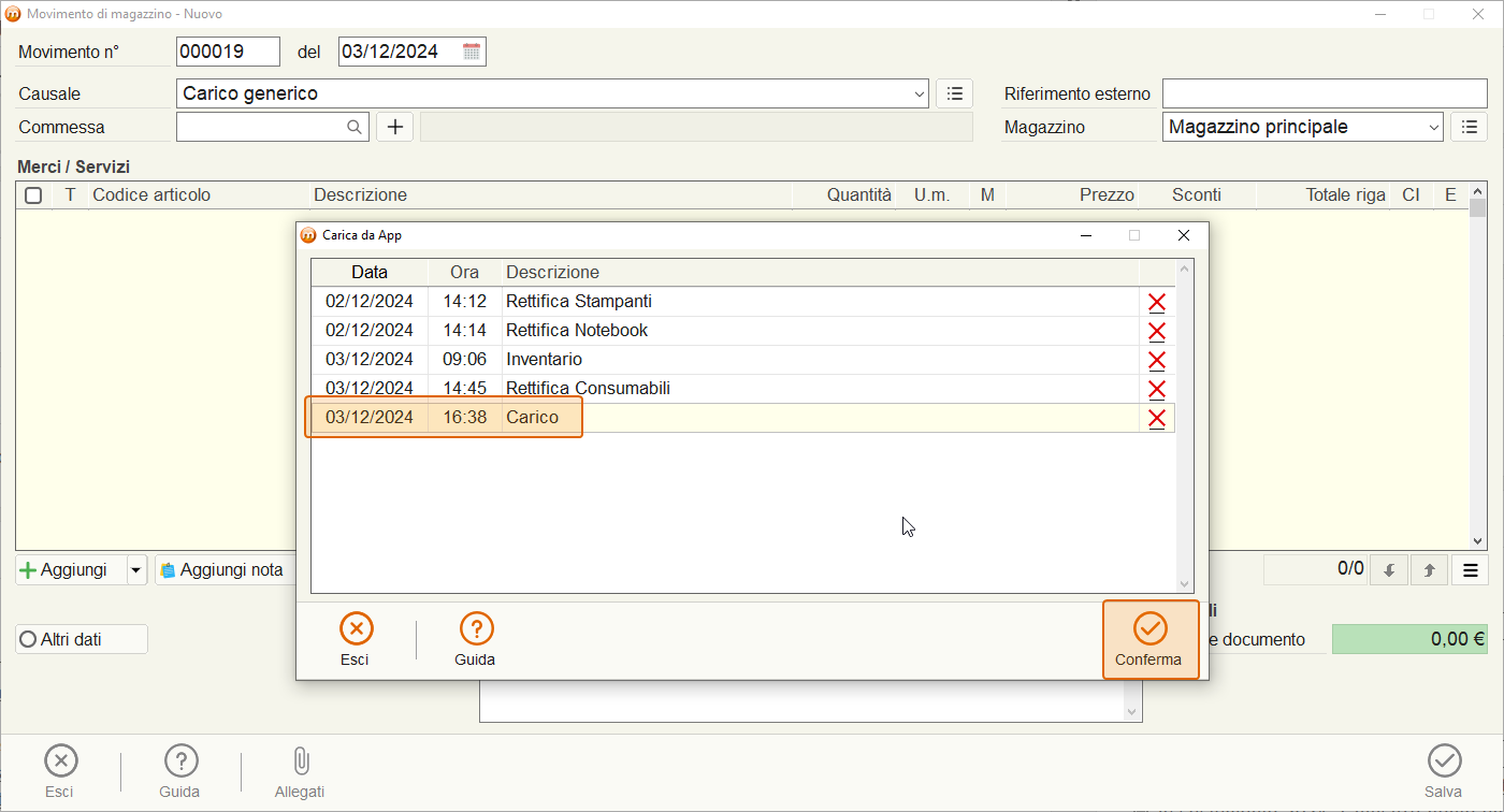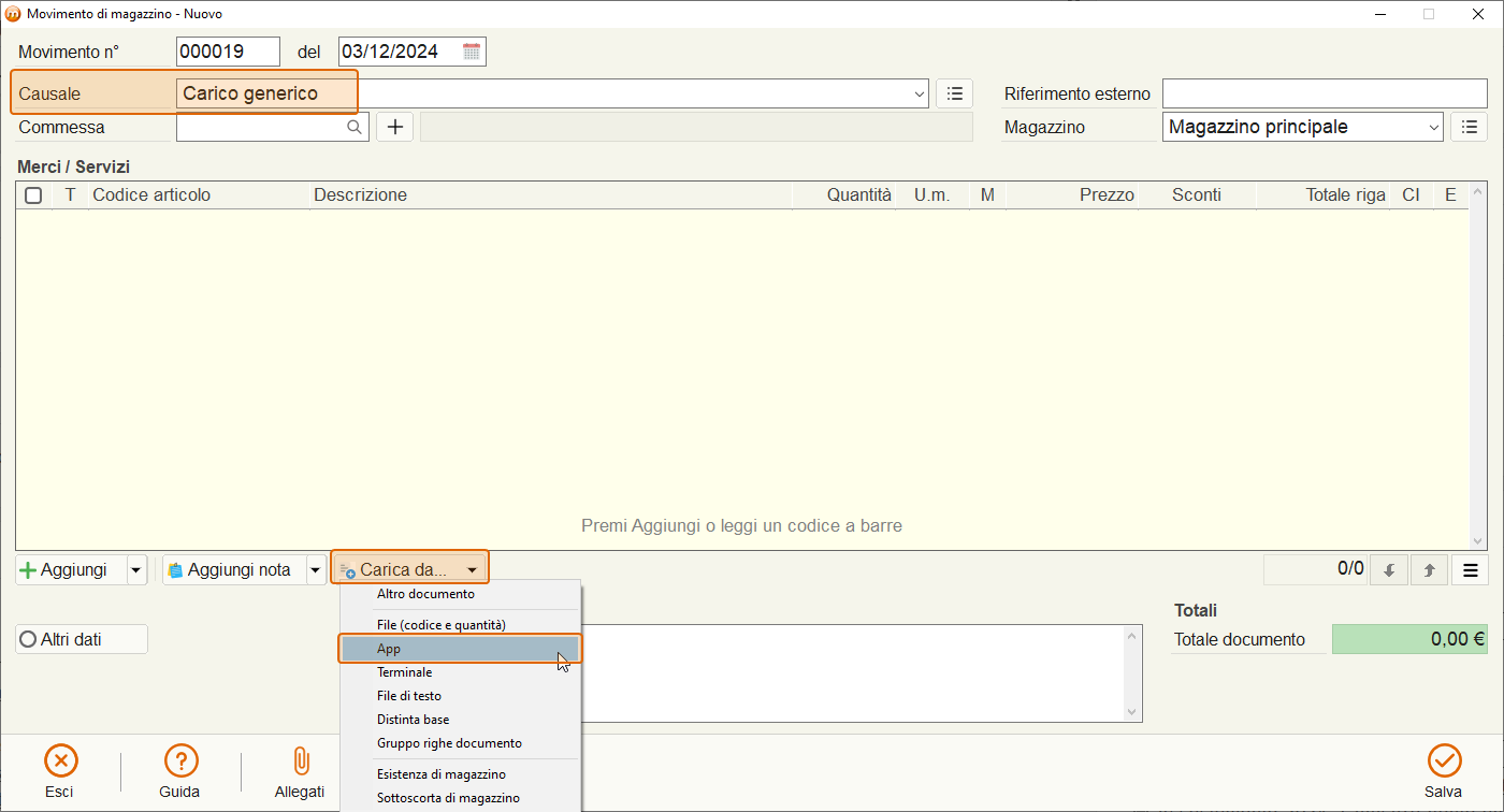 - Seleziona una causale di carico, in questo caso quella con descrizione Carico generico.