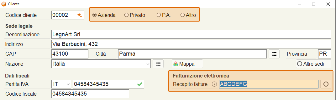 Impostazione del codice destinatario nell'anagrafica dei clienti