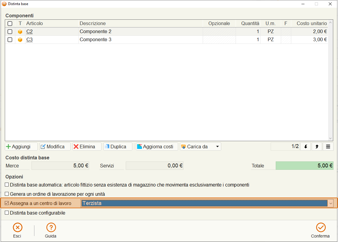 Durante la compilazione della distinta base si dovrà selezionare il centro di lavoro (corrispondente al terzista) che si occuperà della produzione del semilavorato S.