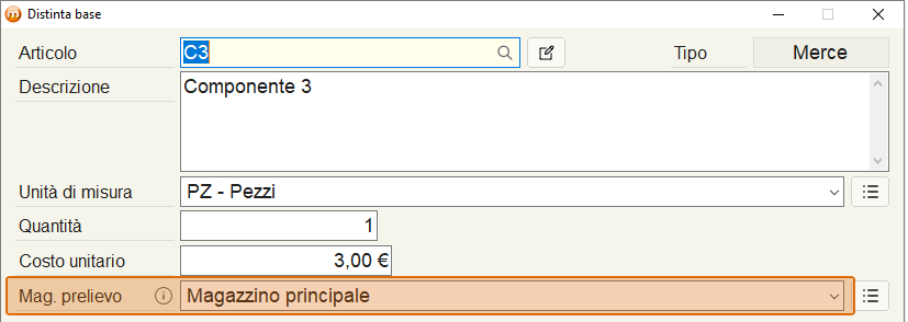 Per ogni singolo componente è necessario indicare il magazzino da cui prelevarlo (vedi immagine sotto), in questo caso il Magazzino principale. Avendo indicato un magazzino diverso da quello del terzista dove verrà effettuata la lavorazione, durante il lancio di produzione sarà generato anche un ordine di consegna a terzista dei componenti C2 e C3.
