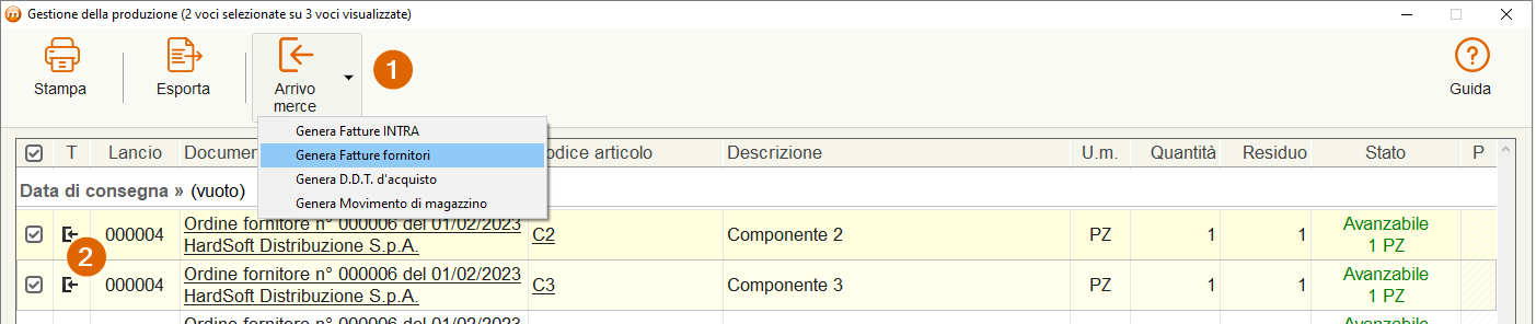 - Selezionare dall’elenco le righe relative ai componenti ricevuti dal fornitore, in questo caso C2 e C3.