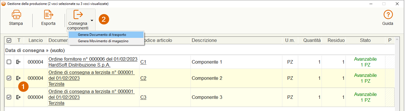 Disponibili i componenti C2 e C3 sarà, possibile inviarli al terzista. La procedura genera un D.D.T. di scarico che evade l’ordine di consegna a terzista: gli articoli vengono scaricati dal magazzino interno e caricati sul magazzino terzista.