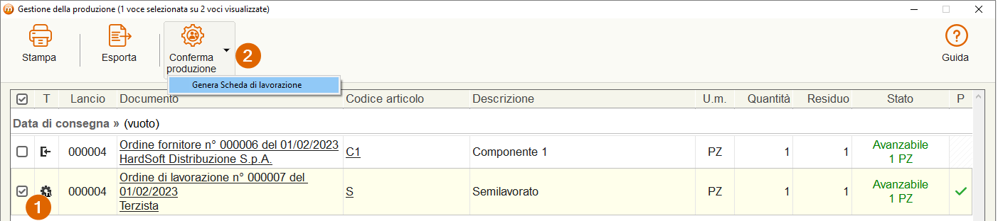 - Premere su Conferma produzione e successivamente cliccare su Genera Scheda di lavorazione.