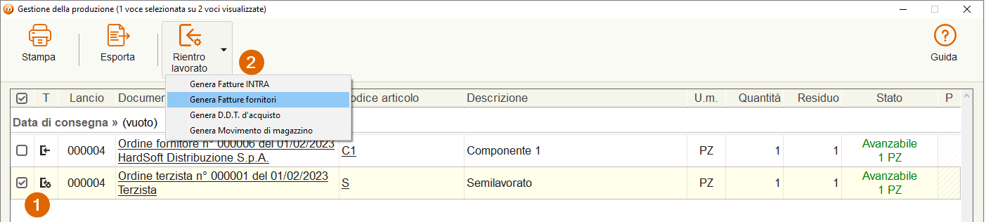 Nella schermata di gestione della produzione, infatti, non saranno più visibili le righe evase dell’ordine fornitore e saranno mostrate quelle relative all’ordine di consegna a terzista, come si vede nell'immagine qui sotto.