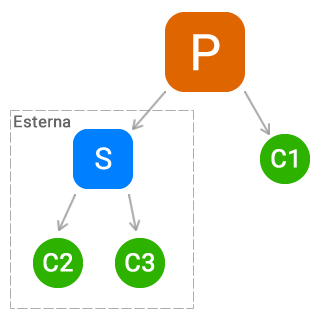 Nell’immagine sotto è riportato lo schema di un articolo con distinta base su due livelli. All’interno dello schema, P indica il prodotto finito, S è il semilavorato prodotto dal terzista e C1, C2, C3 sono i componenti elementari necessari alla lavorazione (materie prime).