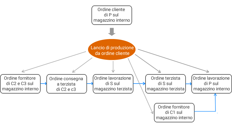 Poiché l’ordine di lavorazione dei prodotti realizzati esternamente agisce sul magazzino associato al terzista, sarà generato anche un ordine a terzista che incrementa la disponibilità del semilavorato nel magazzino in cui avrà luogo la lavorazione successiva (nel caso schematizzato si tratta del magazzino interno) e allo stesso tempo la decrementa sul magazzino di produzione, cioè quello del terzista.