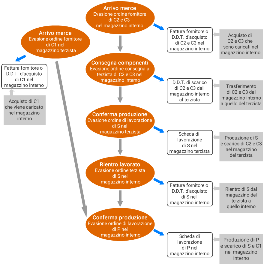 Se la lavorazione di un semilavorato deve essere eseguita presso un terzista, l’ordine di lavorazione corrispondente sarà generato usando il magazzino del fornitore (nello schema è il magazzino terzista) sul quale saranno aggiornate le disponibilità delle materie prime e del semilavorato stesso.
