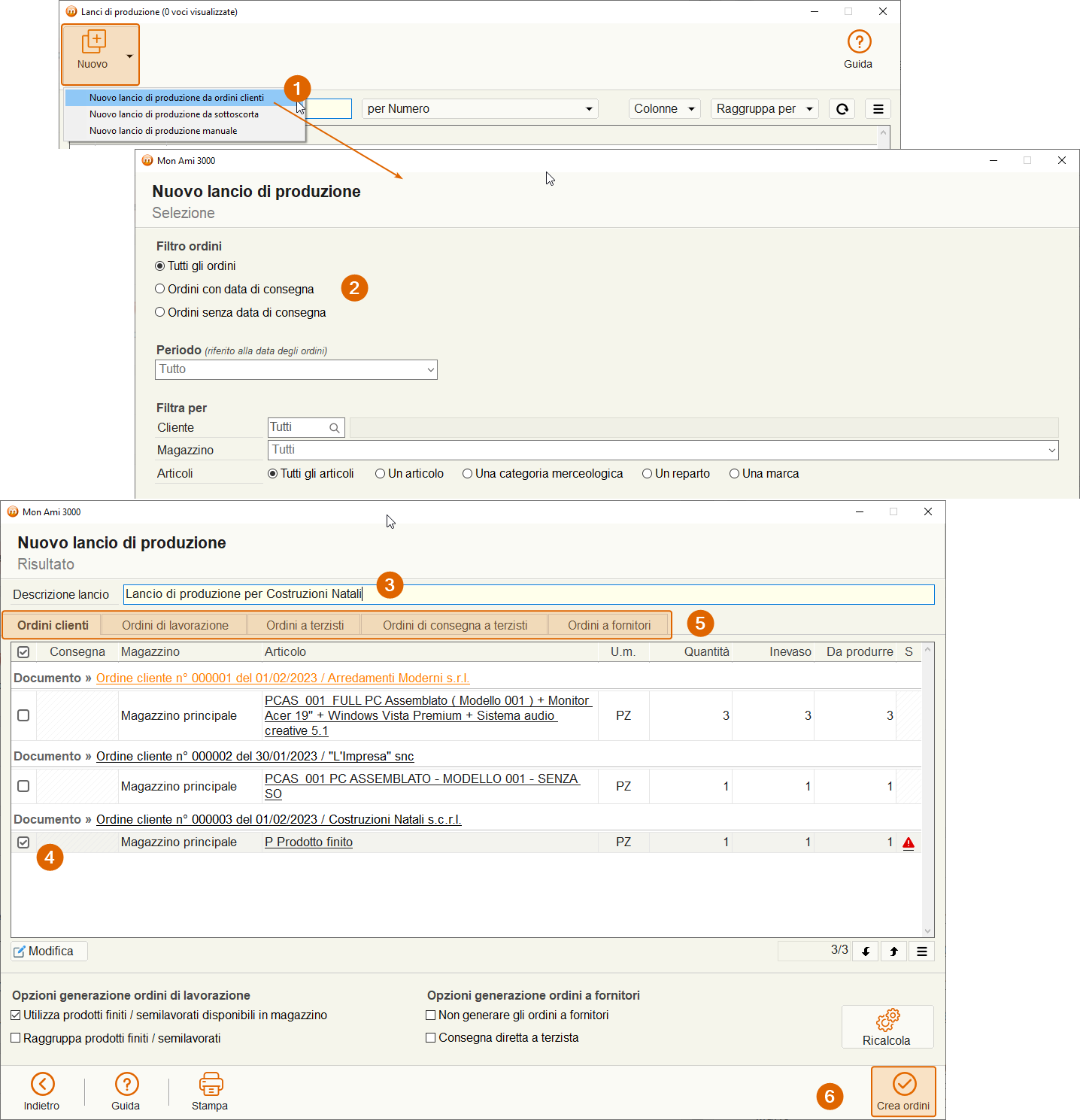 Terminata la generazione degli ordini, sarà richiesto se accedere alla gestione della produzione, premiamo Si.